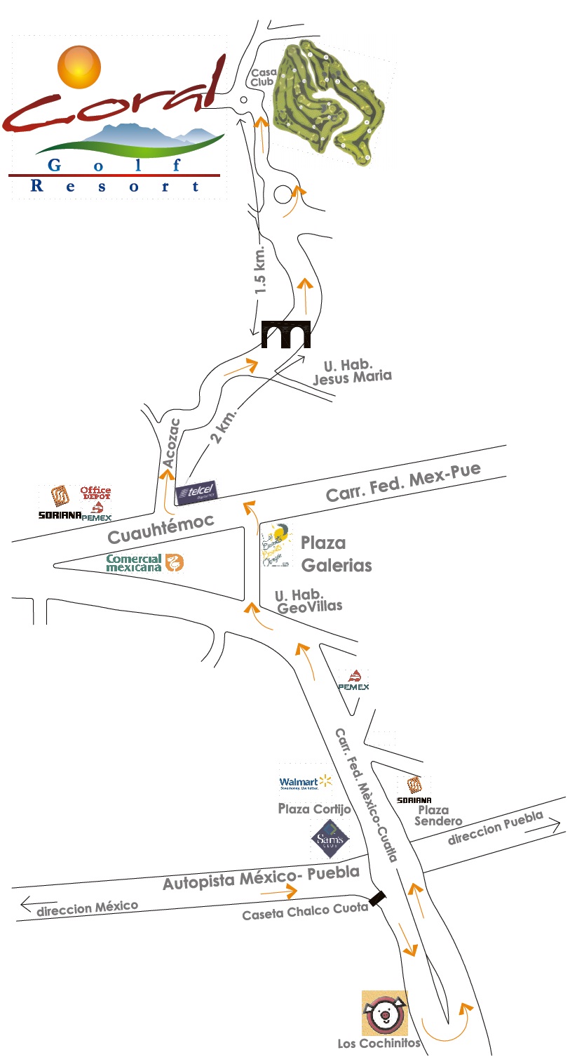 Como llegar Tomar la Calzada Ignacio Zaragoza en dirección a la carretera de Puebla. Ingresar a la Carretera de Cuota México – Puebla, salir en el kilómetro 29.8 que es la salida de la caseta de Chalco; Tomar la Carretera Federal México – Cuautla y dar vuelta en U a la altura del Restaurante Los Cochinitos. Seguir indicaciones hasta el Club de Golf |